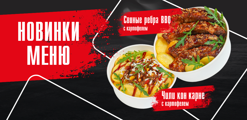 Картофельные слайсы, свиные ребра, лук фри, рукола с соусом барбекю по собственной рецептуре.