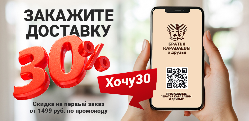 Скачивайте мобильное приложение Братья Караваевы и друзья, вводите промокод ХОЧУ30* и получайте скидку -30% на первый заказ.